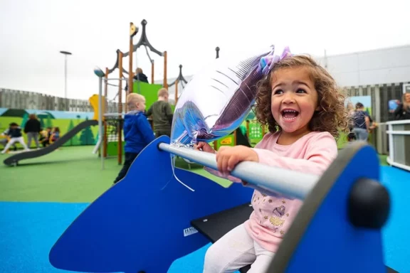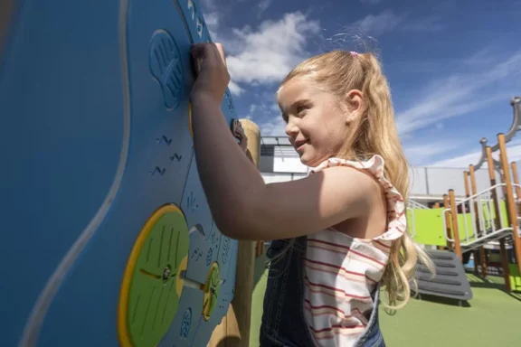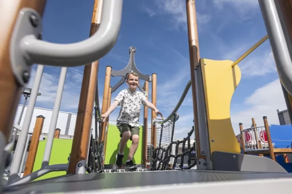 It includes a number of accessible, inclusive features such as an extra wide slide, easy access ramps, and in-ground roundabout suitable for wheelchairs.